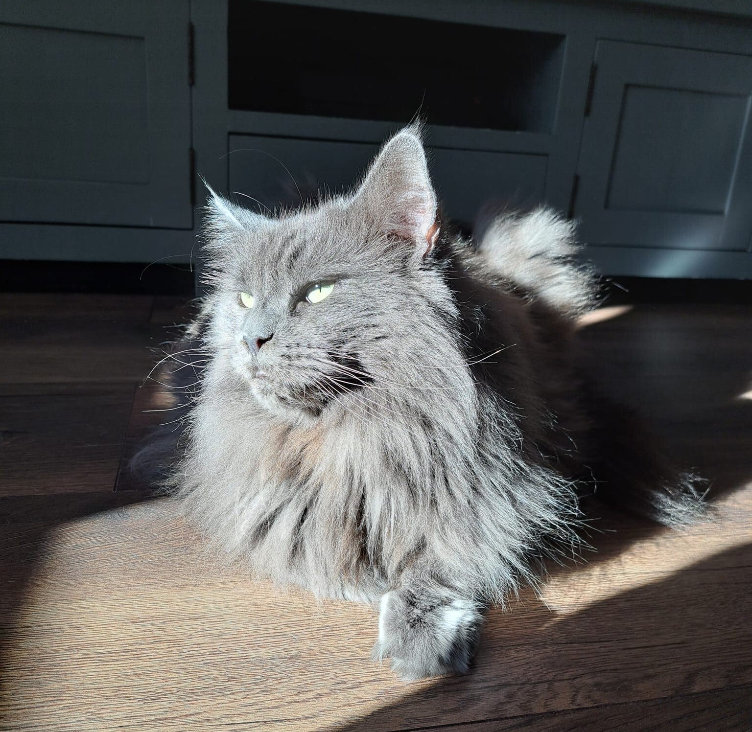 Dat heb je goed gezien: Olenna is inderdaad geen Maine Coon, maar een Cornish Rex. Haar fokker woont bij ons in de buurt, en toen we aan de praat raakten, groeide mijn nieuwsgierigheid naar dit bijzondere ras. Niet lang daarna maakten we écht kennis – en zo is Olenna bij ons komen wonen.