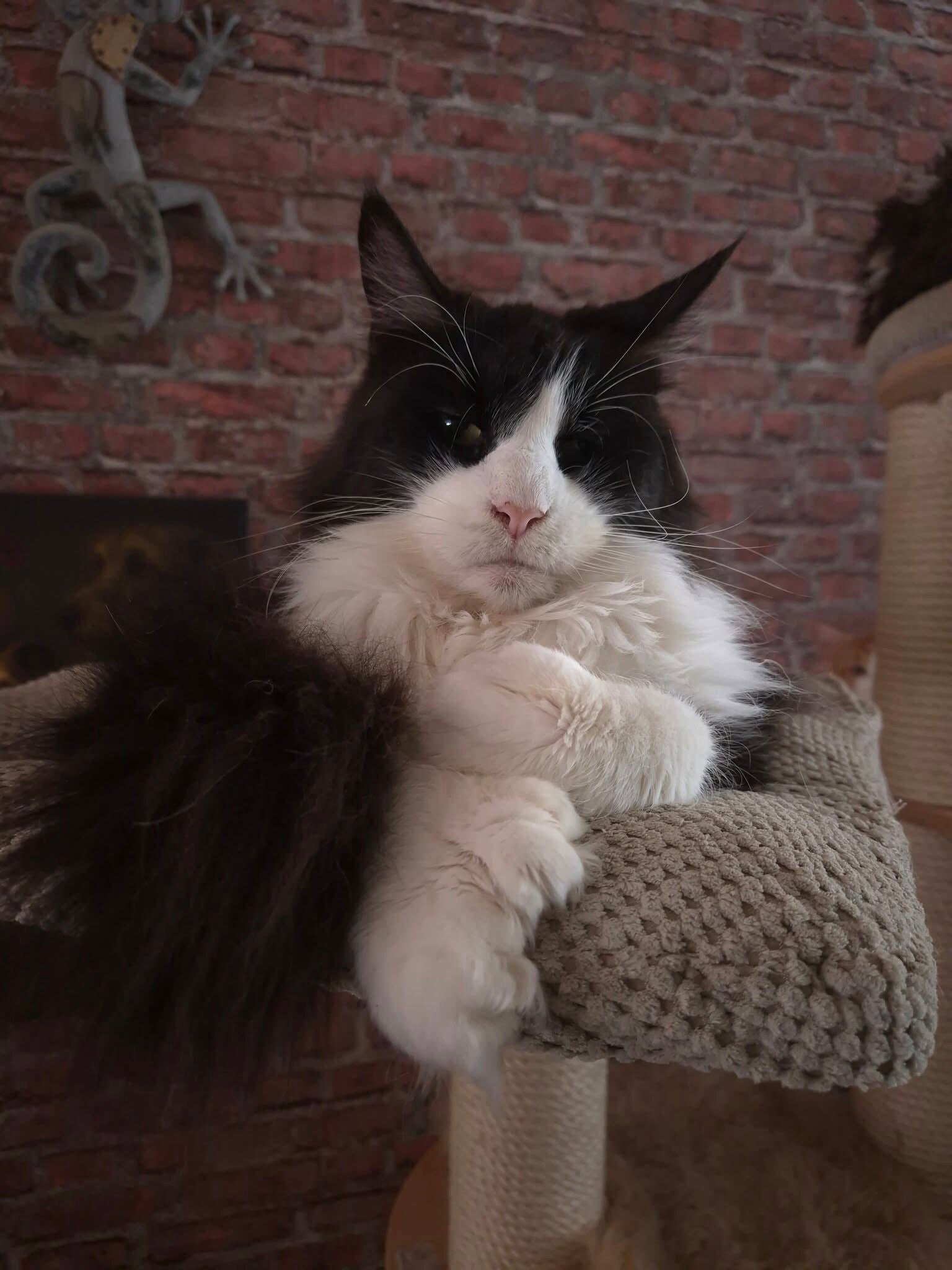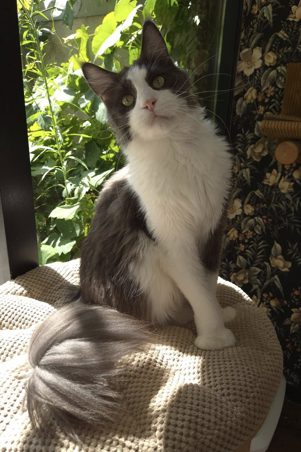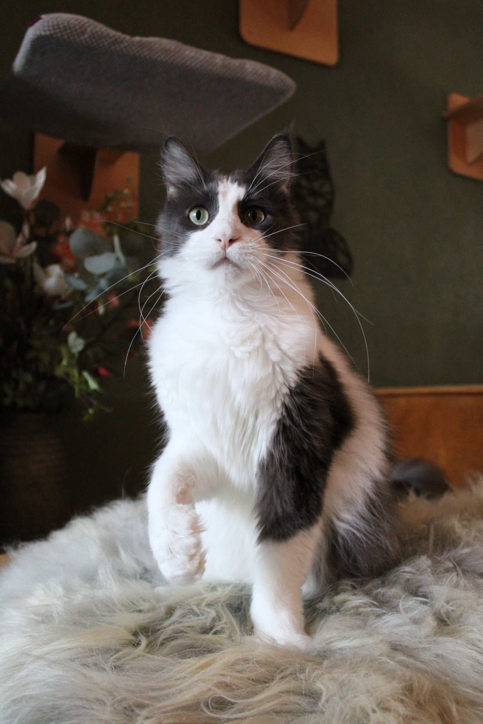 Wolf leeft nu als gelukkige castraat tussen de andere katten, en wat is hij een heerlijk dier! Grappig, lief en vol karakter. Hij zingt regelmatig miauw-serenades in de keuken en kruipt het liefst tegen een andere kat aan. Wolf is zonder twijfel de clown van de familie – we liggen vaak dubbel van het lachen om zijn gekke streken.